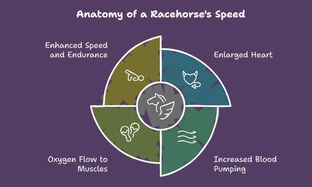 Racehorses have hearts 40% larger than other horses. Their big hearts pump more blood, increasing oxygen flow to muscles. This is key in races like the Kentucky Derby and the Grand National where speed and endurance matter.