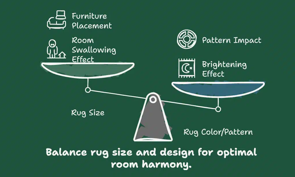 In bedrooms, make sure it extends beyond the bed enough to step onto when you wake up. Light-colored rugs can brighten tight spaces and add warmth without overpowering. Bold patterns work too but avoid anything too busy in very tiny rooms—it might make them feel cramped instead of cozy!