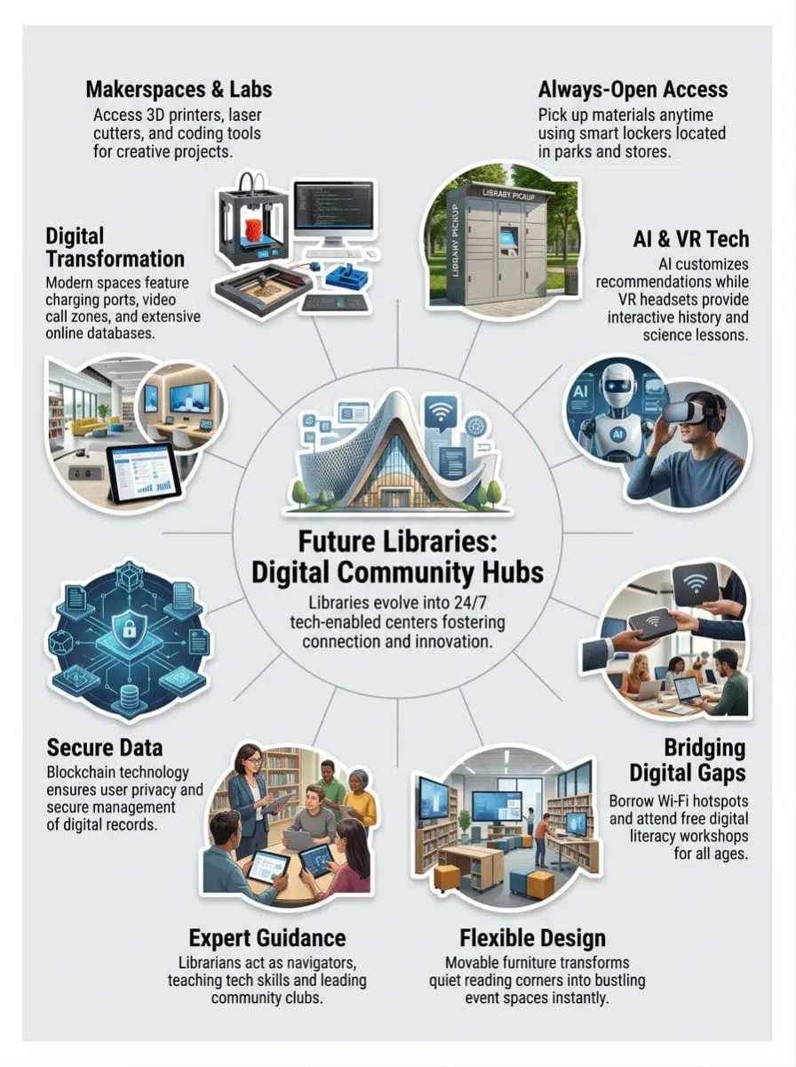 Libraries have successfully transformed from quiet book vaults into lively community centers. They have mixed tradition with powerful tools like AI, makerspaces, and smart lockers to make knowledge easier for you to grab.
