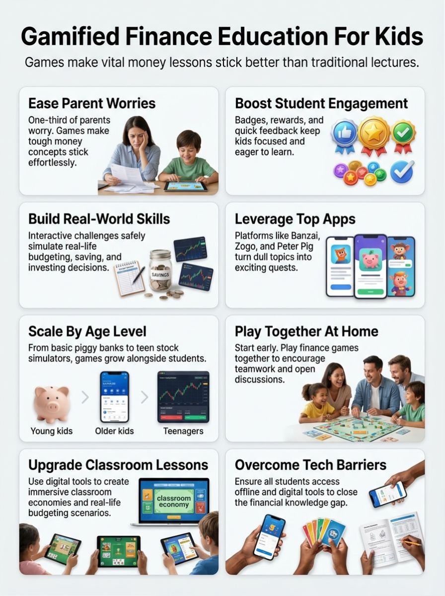 Gamified finance education means teaching money skills using games and play. Interactive learning tools make topics like budgeting, saving, and investment basics feel less scary for children.