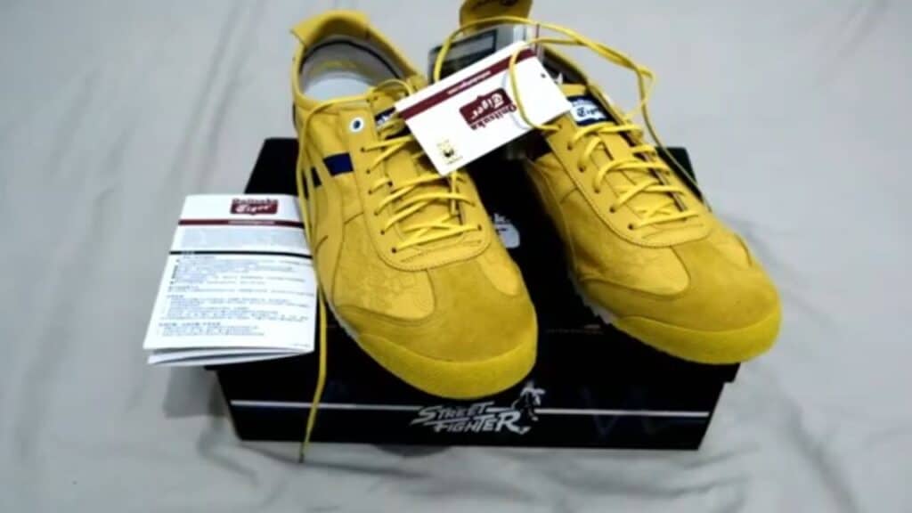 A slip-out card gives Ryu’s profile and iconic Hadoken combo. Each pair ships with extra laces and art decals for personal flair.
