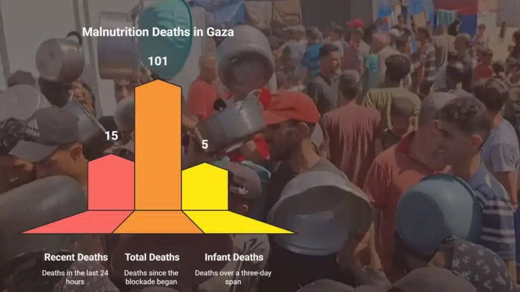 The Gaza Health Ministry announced on Tuesday that 15 more people died of malnutrition in just the last 24 hours, including four children under the age of 10. This brings the official death toll from hunger and famine-related causes to 101 since the beginning of the blockade.