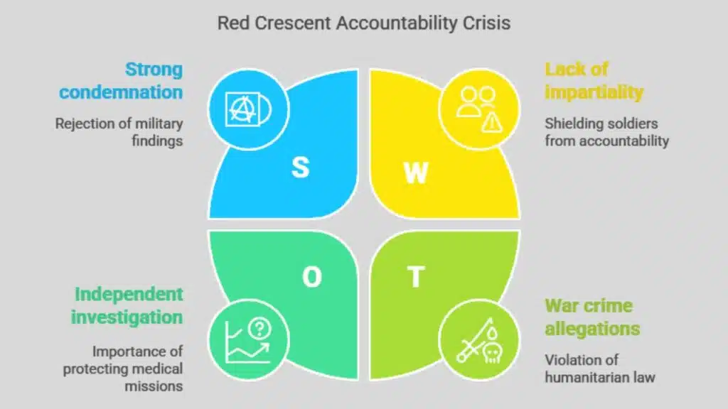 The Palestine Red Crescent Society issued a scathing statement rejecting the findings of the Israeli military. The PRCS accused Israeli authorities of attempting to justify what it called a deliberate and unlawful attack on medical personnel — a serious violation of international humanitarian law and a possible war crime under the Geneva Conventions.