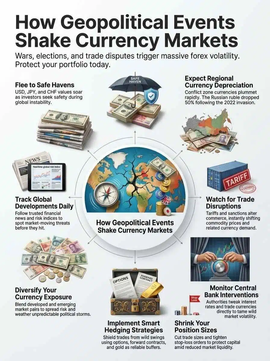 Imagine, you’re trading forex and a sudden election or border clash sends prices on a rollercoaster ride, but you can fight back with smart moves like cutting your trade sizes to dodge big hits, setting up currency options as shields against wild swings, and mixing up your pairs, say blending euros with yen, to spread out the danger—eager for real examples that could save your account? Keep scrolling!