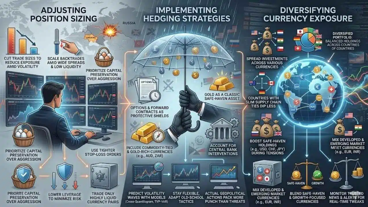 Geopolitical events shake up currency markets, from quick volatility in safe-haven assets like the US dollar to long-term shifts in trade flows and capital flight. Traders can easily manage these risks by adjusting position sizes, hedging with options, and diversifying across currencies, keeping things simple and effective even in wild times.