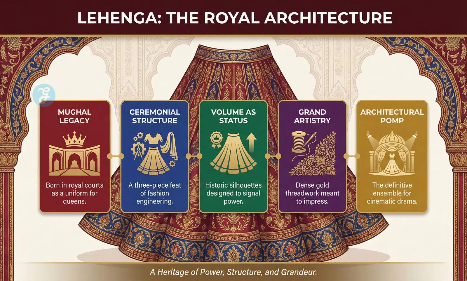 If the saree is a fluid poem, the lehenga is a feat of royal architecture. Its three piece structure of the long skirt, the fitted blouse, and the flowing veil offers a sense of ceremony that few other garments can match.