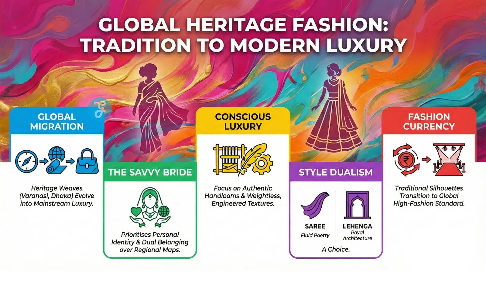 In 2026, the bridal dressing room has become a laboratory for personal expression. We are seeing a historic shift where the rigid lines between the saree and the lehenga are finally dissolving.