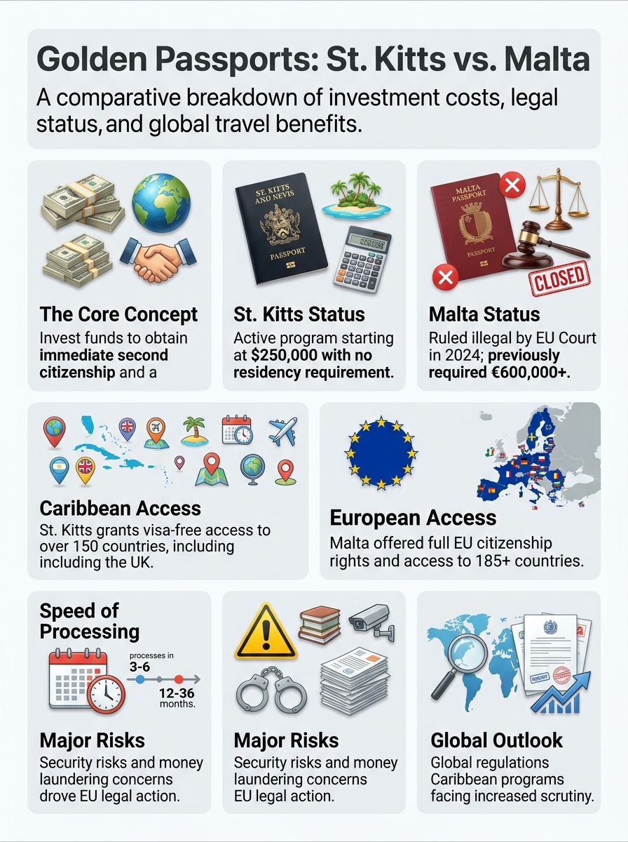 Getting a golden passport opens doors for world travelers. Below, you can weigh the perks of St. Kitts against Malta for hopping across borders with less hassle.