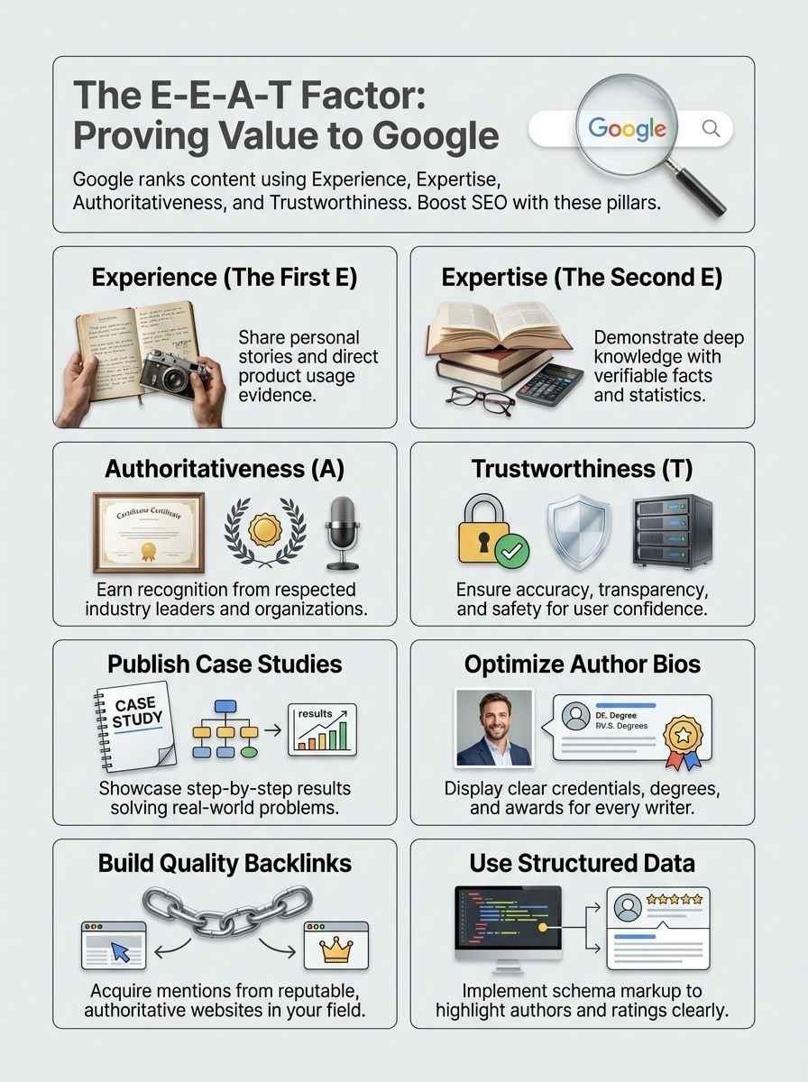 Simple steps can help you shine brighter in Google’s eyes. Grab your readers’ attention with clear proof, then use a few smart tricks to boost trust fast.