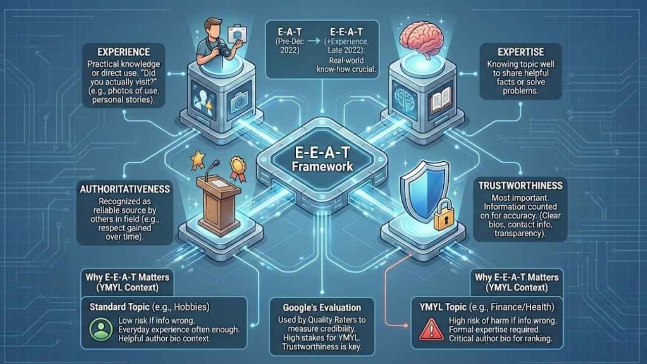 Search engines use the E-E-A-T framework to check content quality. This system helps them tell if a website or author can write with authority and accuracy about a topic. The stakes are high for YMYL pages.