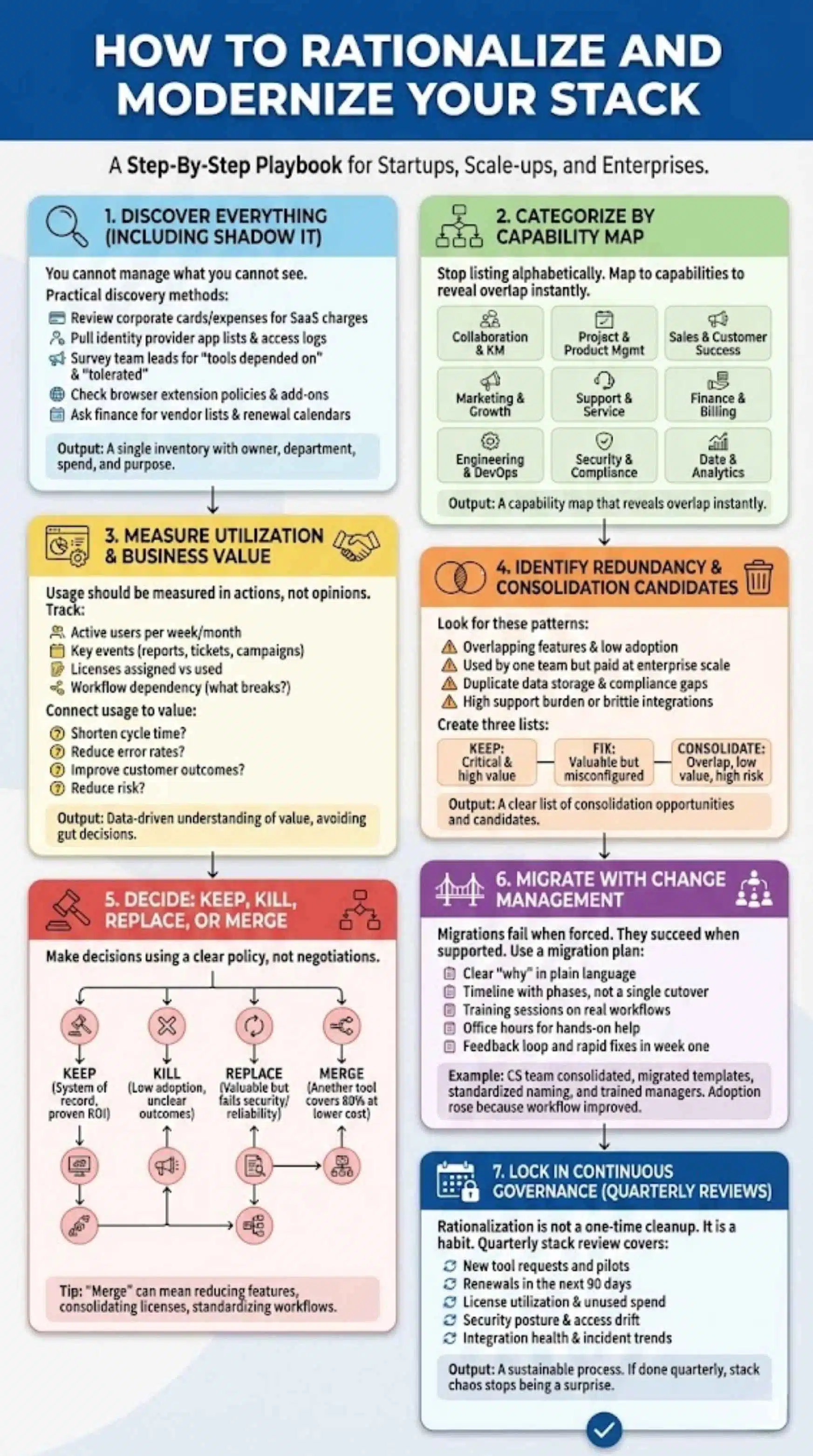 This is also a good point to revisit tech stack consolidation vs best-of-breed decisions using the scorecard, especially for expensive categories like collaboration, analytics, and security.