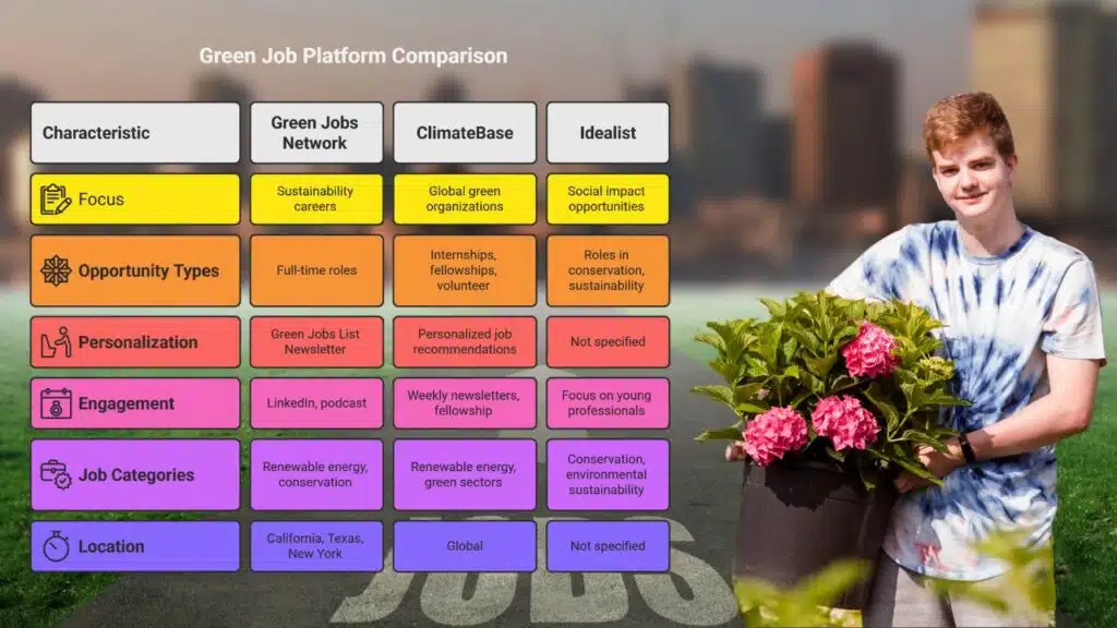 - Platforms like ClimateBase and Idealist offer various green job opportunities.