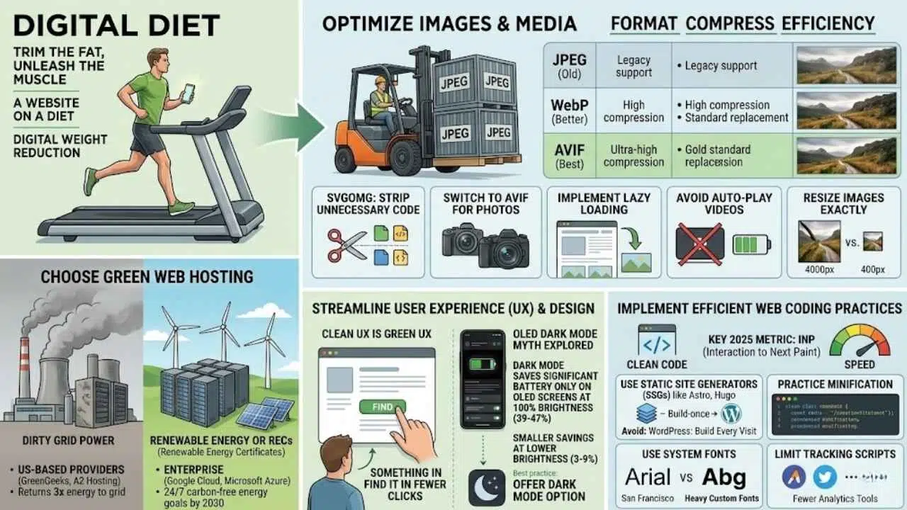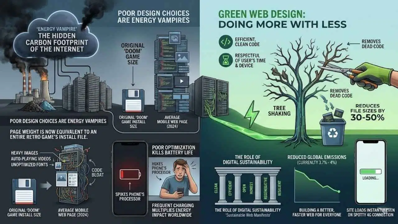 Sloppy design is an energy vampire. Heavy images, auto-playing videos, and unoptimized fonts force data centers to burn more fossil fuels. But the cost isn’t just environmental; it is financial and functional. Slow sites frustrate users and drive up hosting bills.