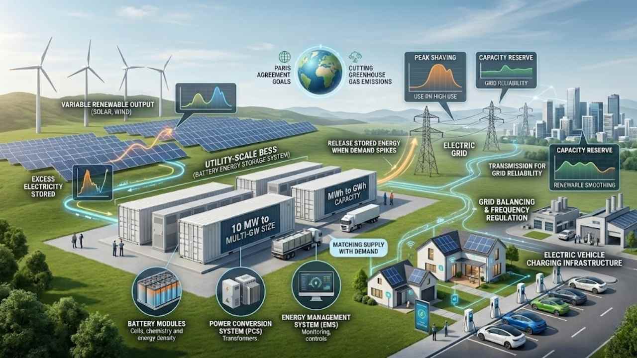 Think of it as a safety net that catches extra energy during sunny or windy peaks, then releases it when demand spikes. Known as utility-scale BESS or large-scale battery storage, these stationary energy storage systems operate at MWh to GWh capacity levels.