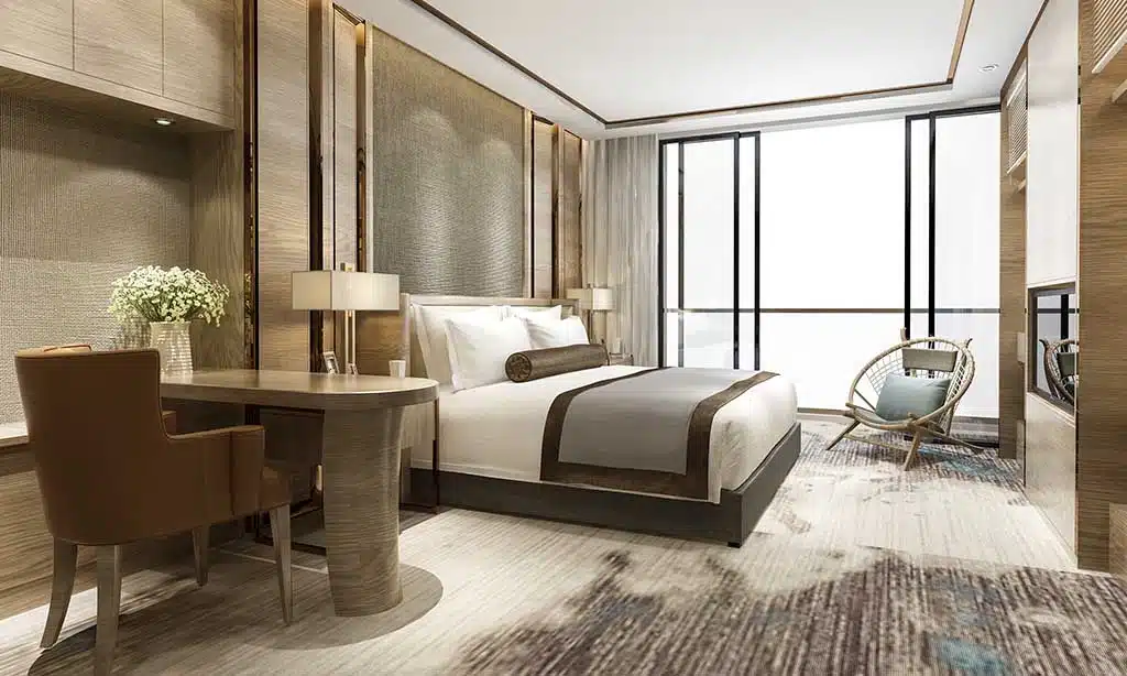Pick stain-resistant fabrics for easy cleaning. Flame-retardant materials add safety to the room. Choose fade-resistant upholstery to keep colors fresh over time. High-quality bedding, like high-thread-count sheets, boosts comfort for guests.