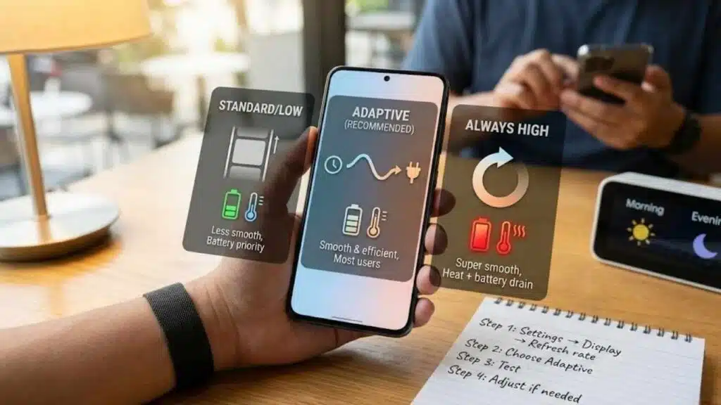 | Phone heats more | Forced high refresh | Switch to Adaptive refresh |