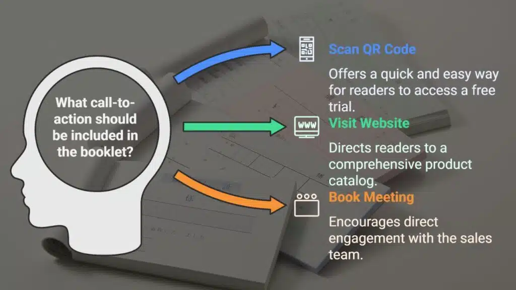 Your booklet is designed to convert. Every great trade show booklet includes a crystal-clear call-to-action (CTA). Tell the reader exactly what to do next.