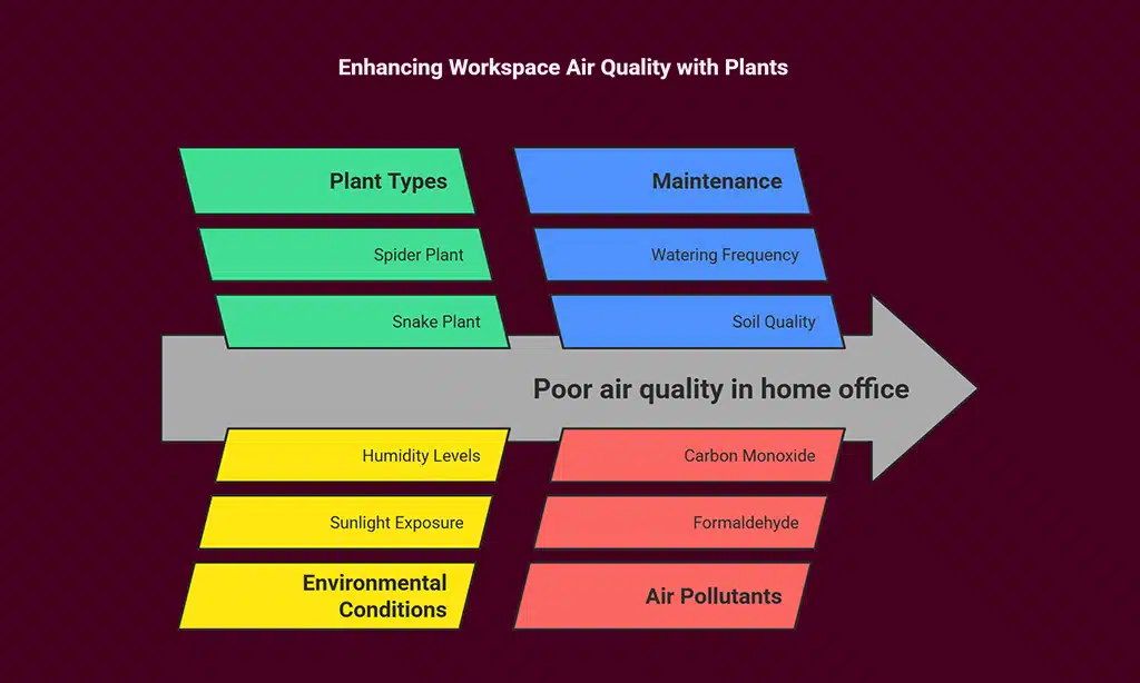 Snake plant asks for little care but gives back plenty. It cleans the air in your home office by filtering out formaldehyde and other bad stuff. Spider plant is a friend too. This green buddy removes carbon monoxide and xylene from the air, which keeps it fresh when you work long hours on remote work projects.
