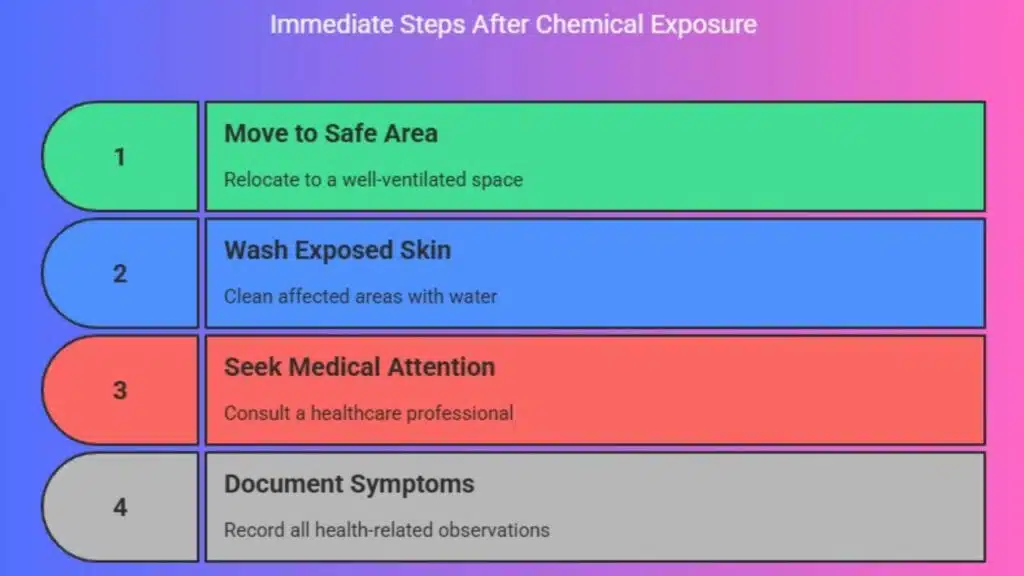 If you suspect exposure to toxic chemicals, immediate action is necessary. First, move to a safe and ventilated area. Then, wash exposed skin thoroughly with water. Seek medical attention to assess any health impact. Document all symptoms and medical evaluations as they can support your legal case.