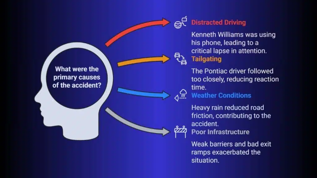 Now, toss in tailgating by the Pontiac driver, and reaction time shrank to almost nothing. Heavy rain poured down, making road friction a real mess, while poor infrastructure, like weak barriers and bad exit ramps, added fuel to the fire.