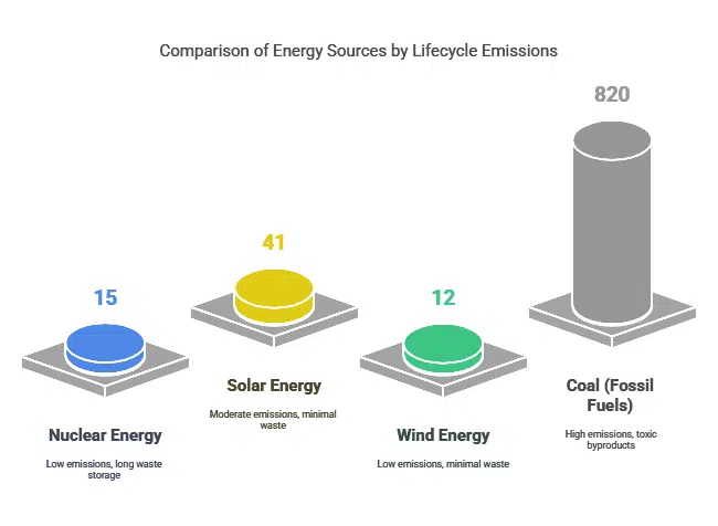 While nuclear energy outperforms fossil fuels in emissions, renewable sources like wind and solar have lower overall environmental impacts. However, renewables’ intermittent nature requires complementary systems like nuclear or energy storage to maintain grid stability.