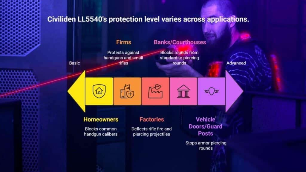 - Military applications: The force fits the LL5540 in vehicle doors, guard posts, and field tents. It meets or beats NIJ Level IV, stopping armor-piercing rounds. Units mount it in mobile command centers or fixed bases. Soldiers and officers work under fire.