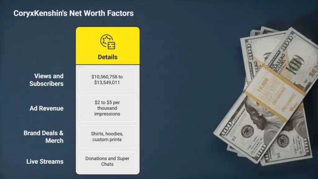 Seeing the numbers makes you sit up. Cory pulls in over a million each month from ad checks and brand spots. AdSense payouts, live stream shows, and merch hits add big layers to his haul.