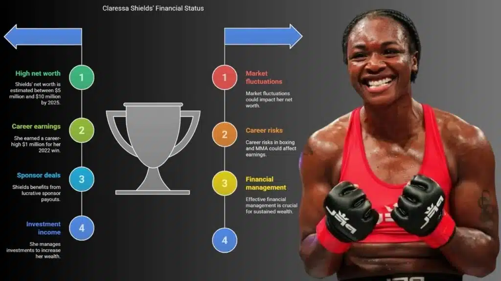 - Claressa Shields’ net worth sits at $5–10 million by 2025, fueled by $1 million-plus fight purses, MMA paydays, and deals with Under Armour and Monster Energy.