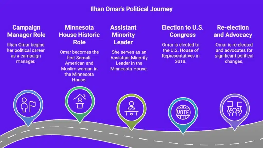 Omar’s career began in Minnesota’s politics. She served in the Minnesota House of Representatives before making history in Congress. Along with Rashida Tlaib, Omar became one of the first Muslim women elected to the U.S. Congress.