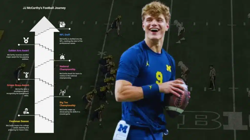 JJ McCarthy keeps rising in the football world, like a rocket shooting for the stars. Fans love his journey from high school fields in La Grange Park, Illinois, to leading the Michigan Wolverines to a national title.