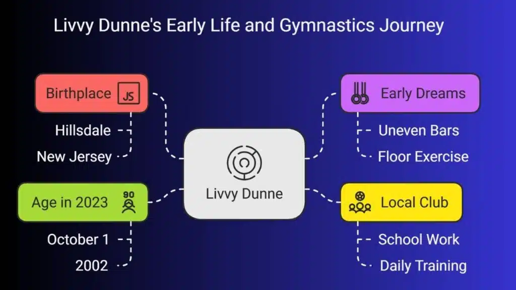 Olivia Dunne, called Livvy Dunne by many, was born in Hillsdale, New Jersey, on October 1, 2002. She hit age 21 in 2023. She nurtured early dreams, flipping on uneven bars and tackling floor exercise at small meets across New Jersey.