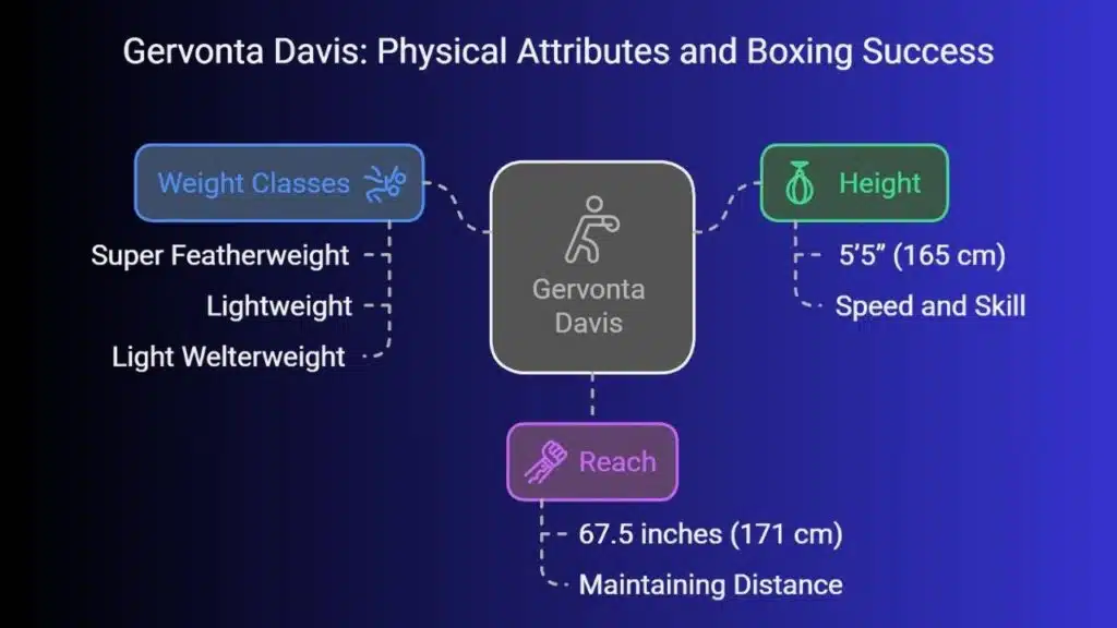 Gervonta Davis stands at 5 feet 5 inches tall. This height is shorter than many boxers. His reach is 67.5 inches. Davis uses his size to move fast and hit hard.