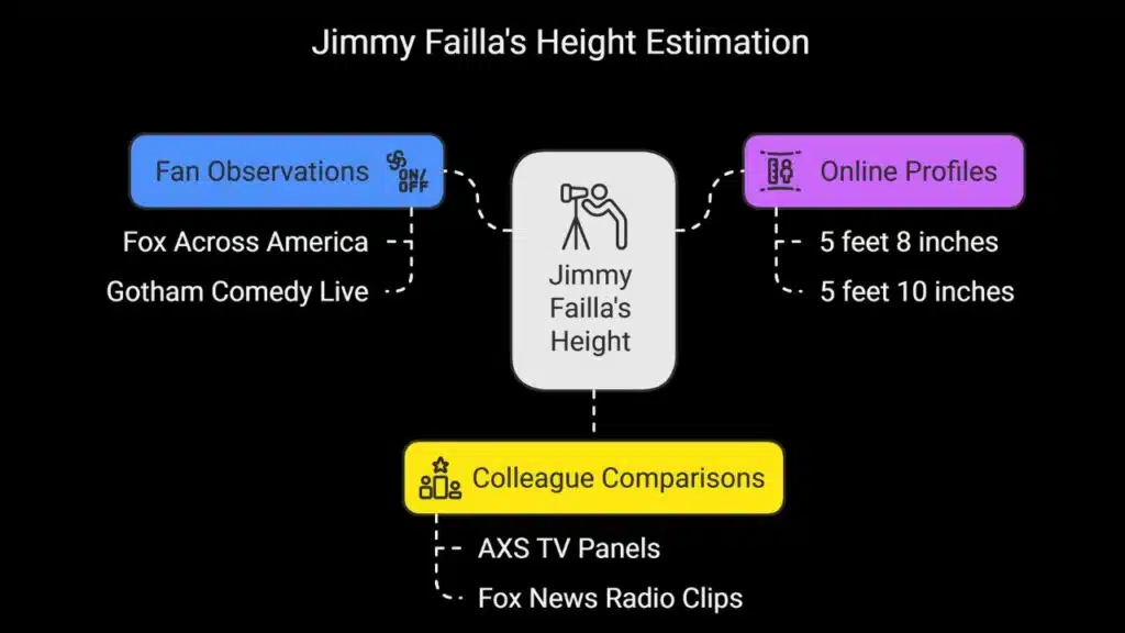 No official source lists Failla’s exact height. Fans spot him beside hosts on Fox Across America and Gotham Comedy Live. They guess he stands near 5 feet 9 inches tall. Photos from AXS TV panels and Fox News Radio clips show him close in stature to colleagues.