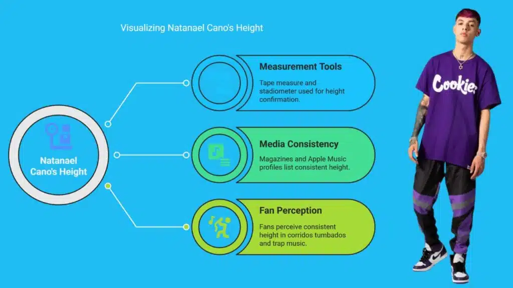 Natanael Cano measures 5 feet 8 inches, or 1.74 meters in the metric system. Event staff used a tape measure and stadiometer to confirm his height before regional Mexican music festivals.