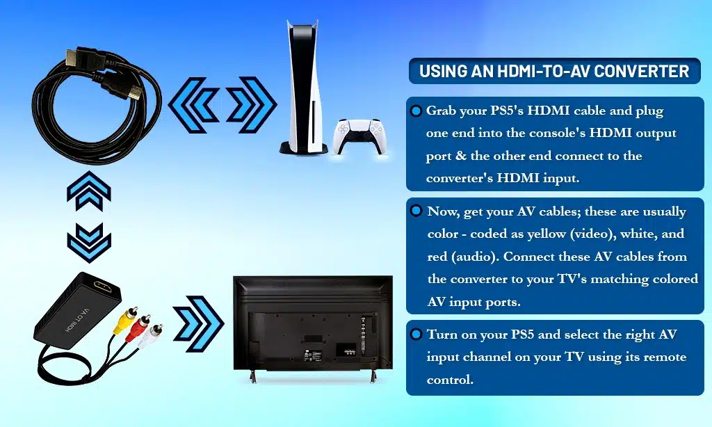Connecting your PS5 to an older TV is possible with an HDMI-to-AV converter. This method works well for displays that only have AV inputs.