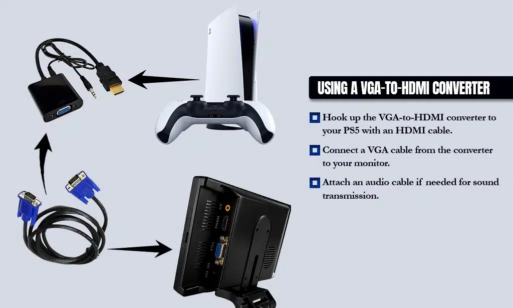 - VGA-to-HDMI Converter: This one is perfect if your monitor has only VGA inputs. It will change the PS5’s digital signal into an analog one that VGA screens can show.