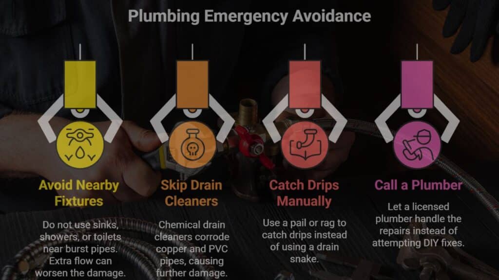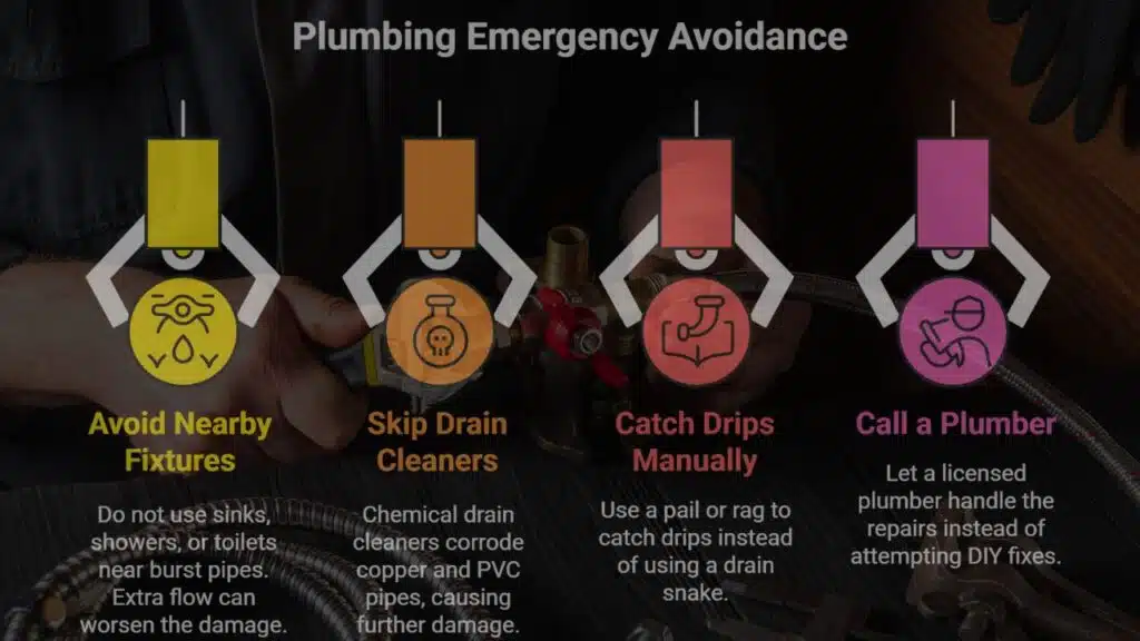 In a plumbing emergency, avoid using nearby taps or fixtures. Don’t run sinks, showers, or an overflowing toilet near a burst pipe. Extra flow can swell the crack and trigger water damage fast.