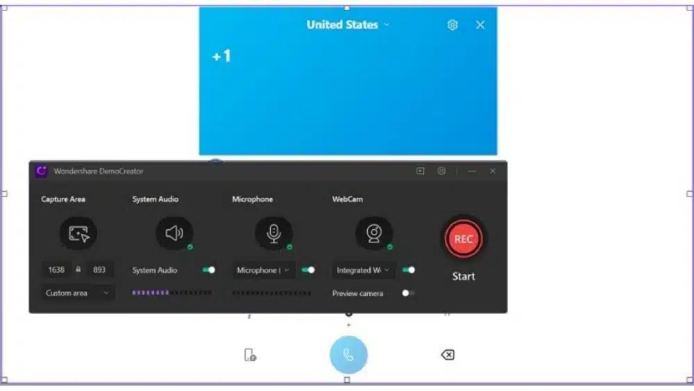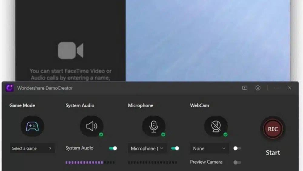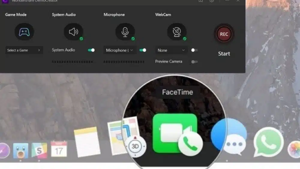 With the Wondershare DemoCreator screen recorder, you can perform the Facetime screen recording as well. You can customize your web screen to the desired extent. From webcams to the audio microphone, you can do all. To do that, hit the desired feature you can seat the main part of the Facetime recording interface as follows: