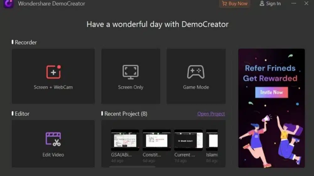 Kickstart by installing and then launching the Wondershare DemoCreator Facetime Screen recorder. Right from the starting interface, select New Recording. The start of the recording UI of DemoCreator is as follows: