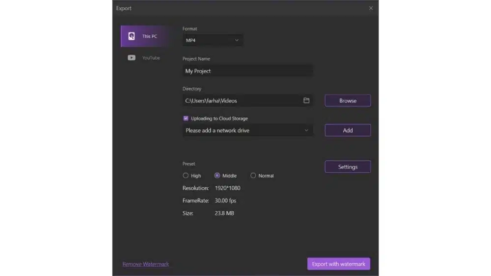 In the last step, you need to save your screen recordings to your desired format so you can have them in your system, in addition to that, you can also share them the YouTube so you can share them directly with your audience. Hence to begin with the export, you need to click on the Export button at the top right corner of the screen as follow: