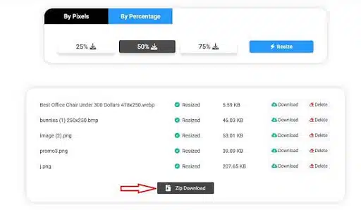 - Once the processing is completed, it will list all the resized images with download option.
