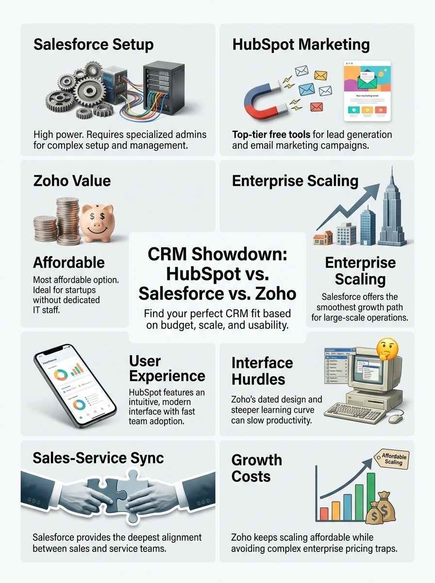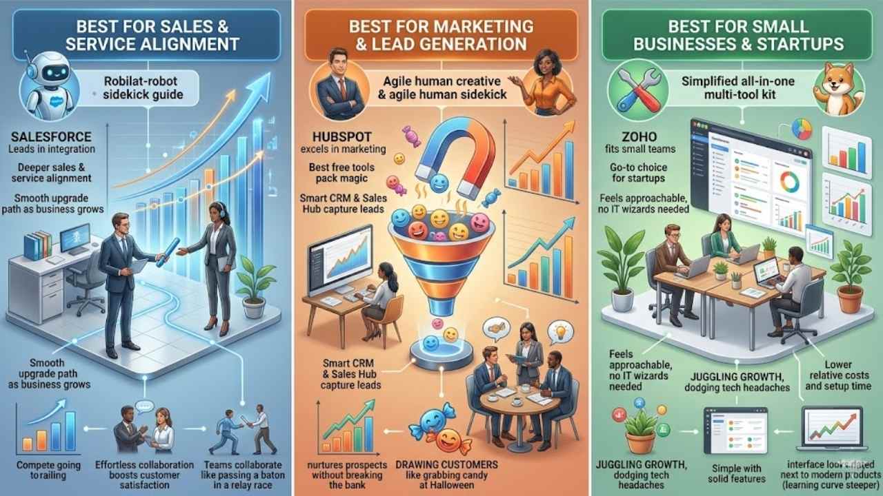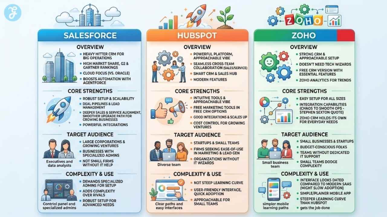 You know, picking the right CRM can feel like finding a trusty sidekick for your business hustle. We break down Salesforce, HubSpot, and Zoho next, so stick around to see which one fits your sales team like a glove.