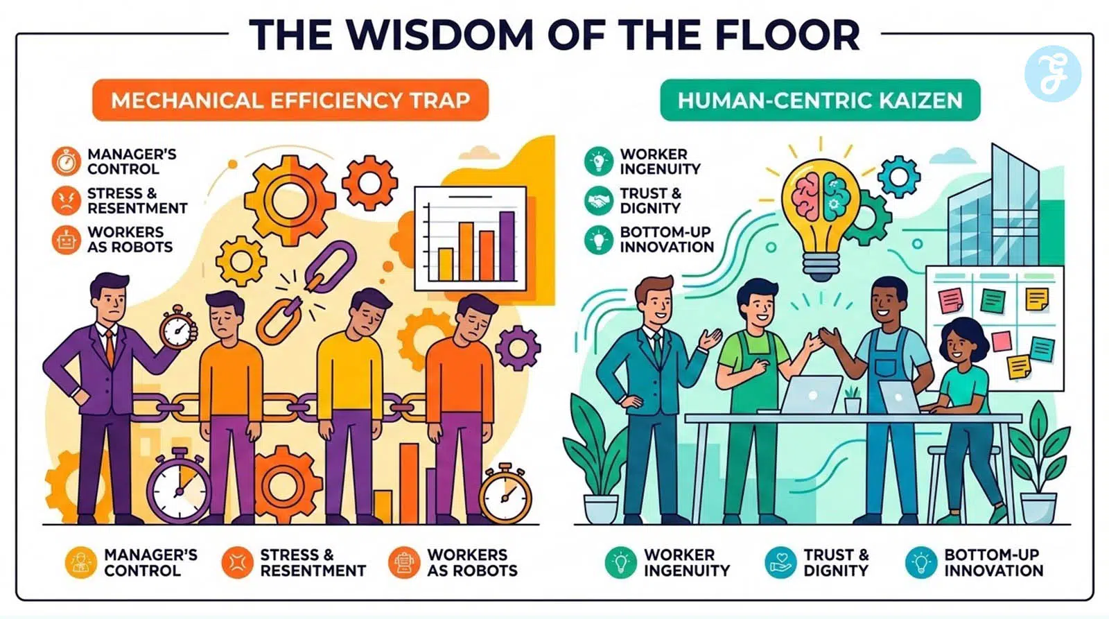 In the original Japanese framework, “Respect for People” is not a soft HR suggestion. It is the engine. When you strip away the human element, you are left with “Fake Lean.” You are left with a system that views employees as biological robots. Robots do not innovate. Robots do not care about your quarterly targets. They simply wait for the clock to strike five.