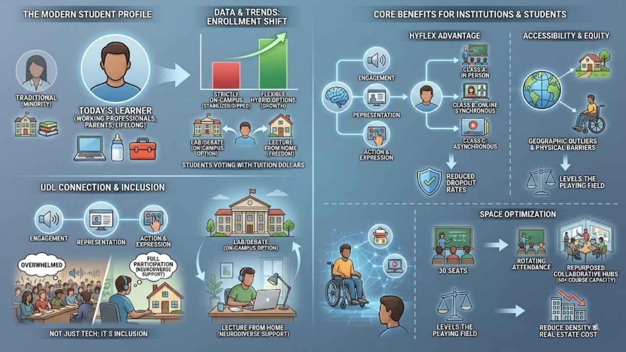 • The “HyFlex” Advantage: The gold standard right now is HyFlex course design. In a HyFlex model, the university doesn’t dictate the mode; the student does. A student might attend Class A in person, Class B online synchronously, and catch up on Class C asynchronously because they had a shift at work. This flexibility reduces dropout rates significantly.