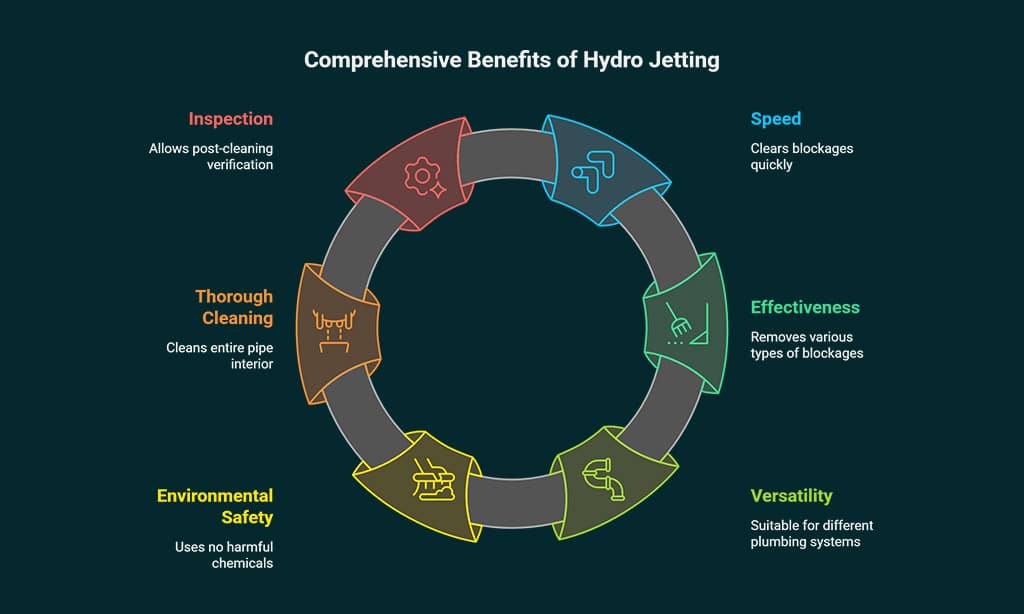 Hydro jetting uses high-pressure water to clean drains. It blasts away tough clogs and buildup in pipes fast and effectively.
