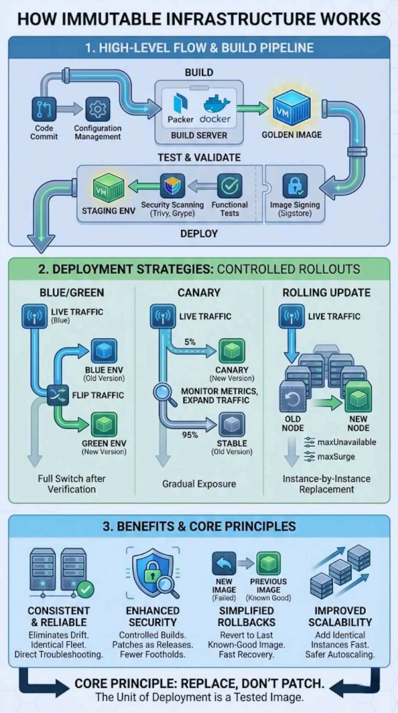 At a high level, immutable infrastructure works by turning servers into outputs of a build process. The “unit of deployment” is a tested image, not a live machine you edit.