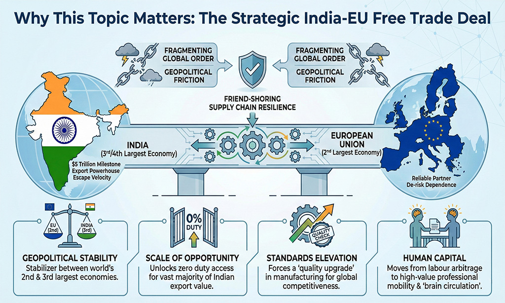 The India-EU Free Trade Deal is not just about reducing tariffs on wine or machinery; it is a strategic response to a fragmenting global order. With traditional trade routes facing geopolitical friction and “friend-shoring” becoming the new mantra for supply chain resilience, this deal provides a stable, rules-based corridor between the world’s second-largest (EU) and fourth-largest (India) economies.