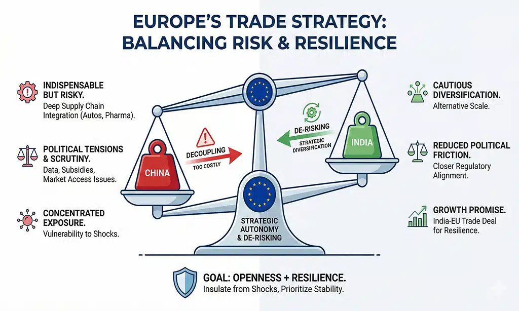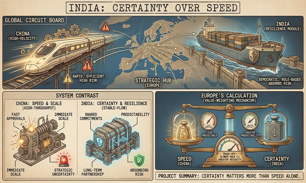 European officials describe it as strategic autonomy in practice. The EU is not leaving China. Trade volumes with Beijing remain massive. But exposure is now being balanced. Supply chains, investment plans, and regulations are all being structured to reduce concentrated risk. In this sense, India emerges as a partner who can absorb uncertainty, rather than replace China’s scale.