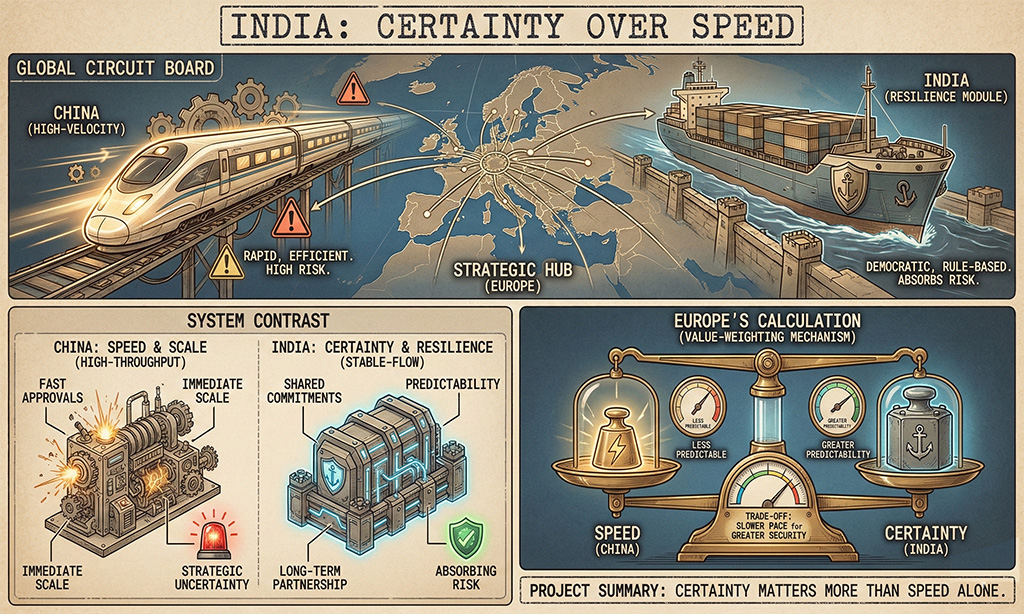 That contrast is central to Europe’s calculation. India is slower than China. Supply chains take longer to stabilise, approvals take time, and scale is built incrementally rather than imposed. But India is also politically safer. It carries fewer strategic uncertainties and offers a partnership that aligns more comfortably with Europe’s economic and institutional values.