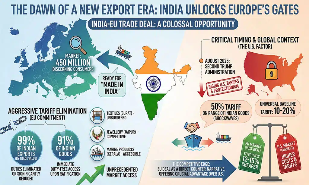 Imagine a colossal market of 450 million discerning consumers, ready to embrace “Made in India.” This is the scale of opportunity unlocked by the India-EU trade deal. This is precisely what the India-EU FTA has unlocked. The numbers are staggering, painting a picture of unprecedented market access and competitive advantage. The European Union, already India’s second-largest trading partner, is now poised to become its most accessible.